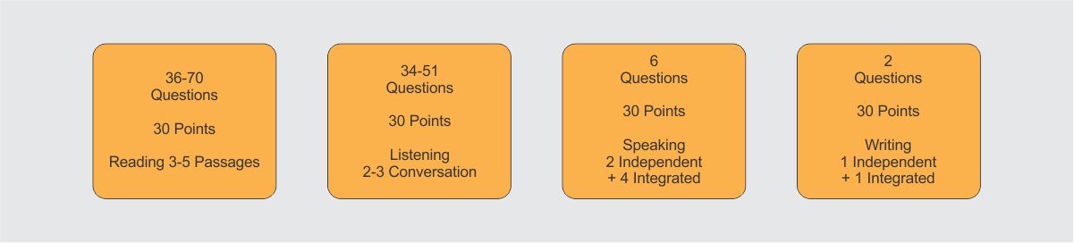 It consists of the Listening, Reading, and Writing sections, with scores that are the same scale as the Internet Based Test. There is no total score.
